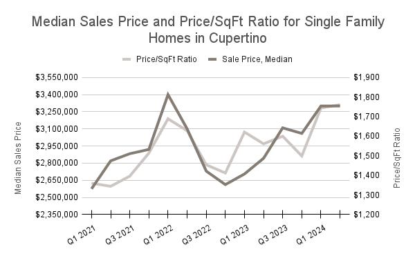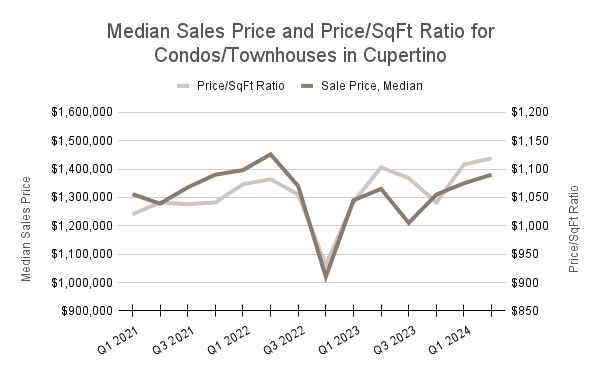 The price per square foot in Cupertino stands at $1,761 for single-family homes, reflecting stable and high property values. Over the past three years, the price per square foot has increased from $1,360 in Q1 2021 to $1,761 in Q2 2024, indicating a strong and consistent appreciation in property values. The city’s blend of suburban charm and urban amenities makes it an attractive location for homebuyers, contributing to the strong demand and competitive pricing. For condominiums and townhouses, the price per square foot has risen from $1,020 in Q1 2021 to $1,119 in Q2 2024, reflecting the increasing value of these properties. This trend shows that even more affordable housing options are appreciating significantly, making Cupertino a solid investment for various types of buyers.