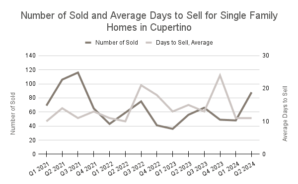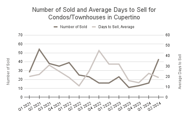 Cupertino, renowned for its top-tier schools and proximity to major tech campuses, continues to be a highly desirable area for homebuyers. As of Q2 2024, Cupertino’s real estate market shows a number of 88 sold single-family homes. Homes are selling quickly, with single-family homes averaging just 11 days on the market. This rapid turnover highlights the strong demand for properties in this city, driven by its strategic location and high quality of life. The quick pace of sales indicates a competitive market where buyers need to act swiftly to secure homes. Similarly, the condominium and townhouse segment in Cupertino is performing robustly. As of Q2 2024, there are 43 sold units, with these properties averaging 19 days on the market. This rapid turnover for condos and townhouses indicates strong demand, particularly appealing to those seeking a more affordable entry into the market while enjoying the same desirable location and amenities.