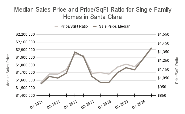 The price per square foot in Santa Clara stands at $1,394 for single-family homes, reflecting stable and high property values. Over the past three years, the price per square foot has increased from $995 in Q1 2021 to $1,394 in Q2 2024, indicating a strong and consistent appreciation in property values. The city’s blend of suburban charm and urban amenities makes it an attractive location for homebuyers, contributing to the strong demand and competitive pricing. For condominiums and townhouses, the price per square foot has risen from $744 in Q1 2021 to $872 in Q2 2024, reflecting the increasing value of these properties. This trend shows that even more affordable housing options are appreciating significantly, making Santa Clara a solid investment for various types of buyers.