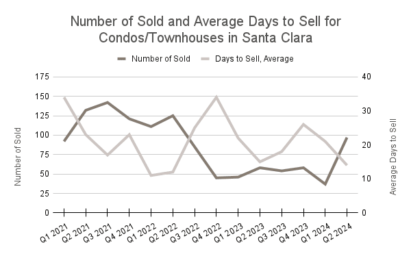 Santa Clara, at the heart of Silicon Valley, continues to attract homebuyers with its combination of tech industry proximity and suburban appeal. As of Q2 2024, Santa Clara’s real estate market shows a number of 144 sold single-family homes. Homes are selling quickly, with single-family homes averaging just 11 days on the market. This rapid turnover highlights the strong demand for properties in this city, driven by its strategic location and high quality of life. The quick pace of sales indicates a competitive market where buyers need to act swiftly to secure homes. Similarly, the condominium and townhouse segment in Santa Clara is performing robustly. As of Q2 2024, there are 97 sold units, with these properties averaging 14 days on the market. This rapid turnover for condos and townhouses indicates strong demand, particularly appealing to those seeking a more affordable entry into the market while enjoying the same desirable location and amenities.