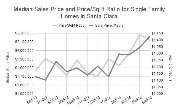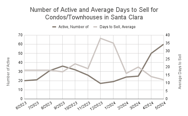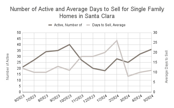 Santa Clara, home to numerous tech companies and Santa Clara University, offers a blend of vibrant city life and suburban charm. As of May 2024, Santa Clara’s real estate market is highly competitive, with 36 active listings for single-family homes and 60 active listings for townhouses and condos. Homes are selling quickly, with single-family homes averaging 11 days on the market and townhouses/condos averaging 12 days. This quick turnover reflects the strong buyer demand in the area, driven by the city’s strategic location and the high quality of life it offers.