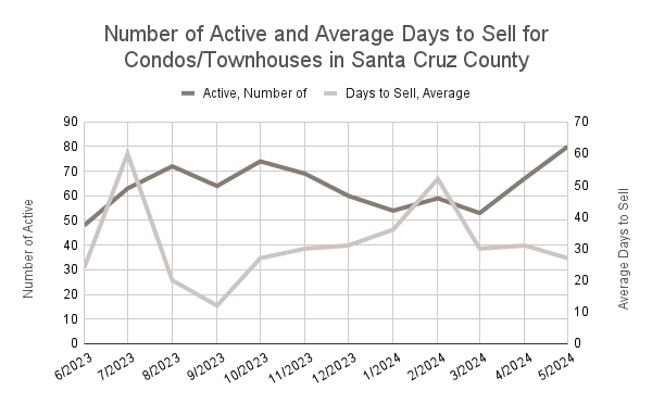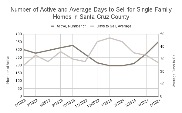 Santa Cruz County, renowned for its picturesque beaches and vibrant community, is a desirable location for homebuyers seeking a blend of coastal living and natural beauty. As of May 2024, the real estate market in Santa Cruz County shows 352 active listings for single-family homes and 80 active listings for townhouses and condos. Homes are selling in an average of 27 days, whether they are single-family homes or townhouses/condos. This longer selling period suggests a more balanced market compared to neighboring areas, providing buyers with more time to make decisions and explore their options in this scenic region.