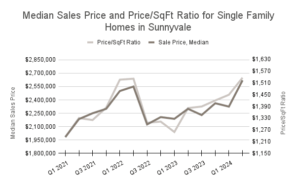 The median sale price in Sunnyvale is $2,620,000 for single-family homes, showcasing the ongoing demand and competitive nature of the market. Historically, the median sale price has seen a significant rise from $1,982,500 in Q1 2021, reflecting a substantial increase over three years. These significant median prices reflect the desirability of Sunnyvale as a residential destination, where the combination of economic opportunities, excellent schools, and a vibrant community life creates a strong market. The condominium and townhouse market also shows strong performance, with a median sale price of $1,400,000 in Q2 2024, up from $1,265,000 in Q1 2021. This increase highlights the growing demand and rising property values in this segment as well. As we move further into 2024, these trends are expected to continue, reinforcing Sunnyvale’s position as a key residential area in the region. The continued influx of homebuyers, coupled with the city’s robust economic base, will likely sustain high property values and competitive sales across all types of residential real estate.