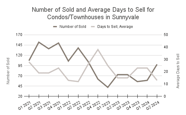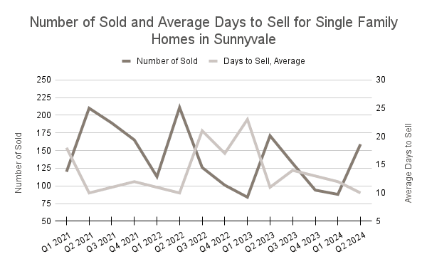 Sunnyvale, nestled in the heart of Silicon Valley, continues to attract homebuyers with its blend of tech-centric opportunities and suburban charm. As of Q2 2024, Sunnyvale’s real estate market shows a number of 159 sold single-family homes. Homes are selling quickly, with single-family homes averaging just 10 days on the market. This rapid turnover highlights the strong demand for properties in this city, driven by its strategic location and high quality of life. The quick pace of sales indicates a competitive market where buyers need to act swiftly to secure homes. Similarly, the condominium and townhouse segment in Sunnyvale is performing robustly. As of Q2 2024, there are 98 sold units, with these properties averaging 13 days on the market. This rapid turnover for condos and townhouses indicates strong demand, particularly appealing to those seeking a more affordable entry into the market while enjoying the same desirable location and amenities.